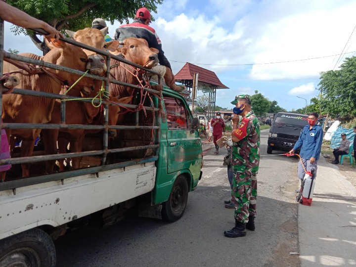 Upaya pencegahan dan antisipasi penyebaran Penyakit Mulut dan Kuku (PMK) pada hewan, anggota Koramil 0826-04 Galis dan Polsek Galis bersama UPT Puskesmas Galis memberikan himbauan serta penyemprotan ke kendaraan pengangkut sapi di lokasi Pasar Keppo, Desa Polagan, Kecamatan Galis, Kabupaten Pamekasan, pada Sabtu (11/06/2022).