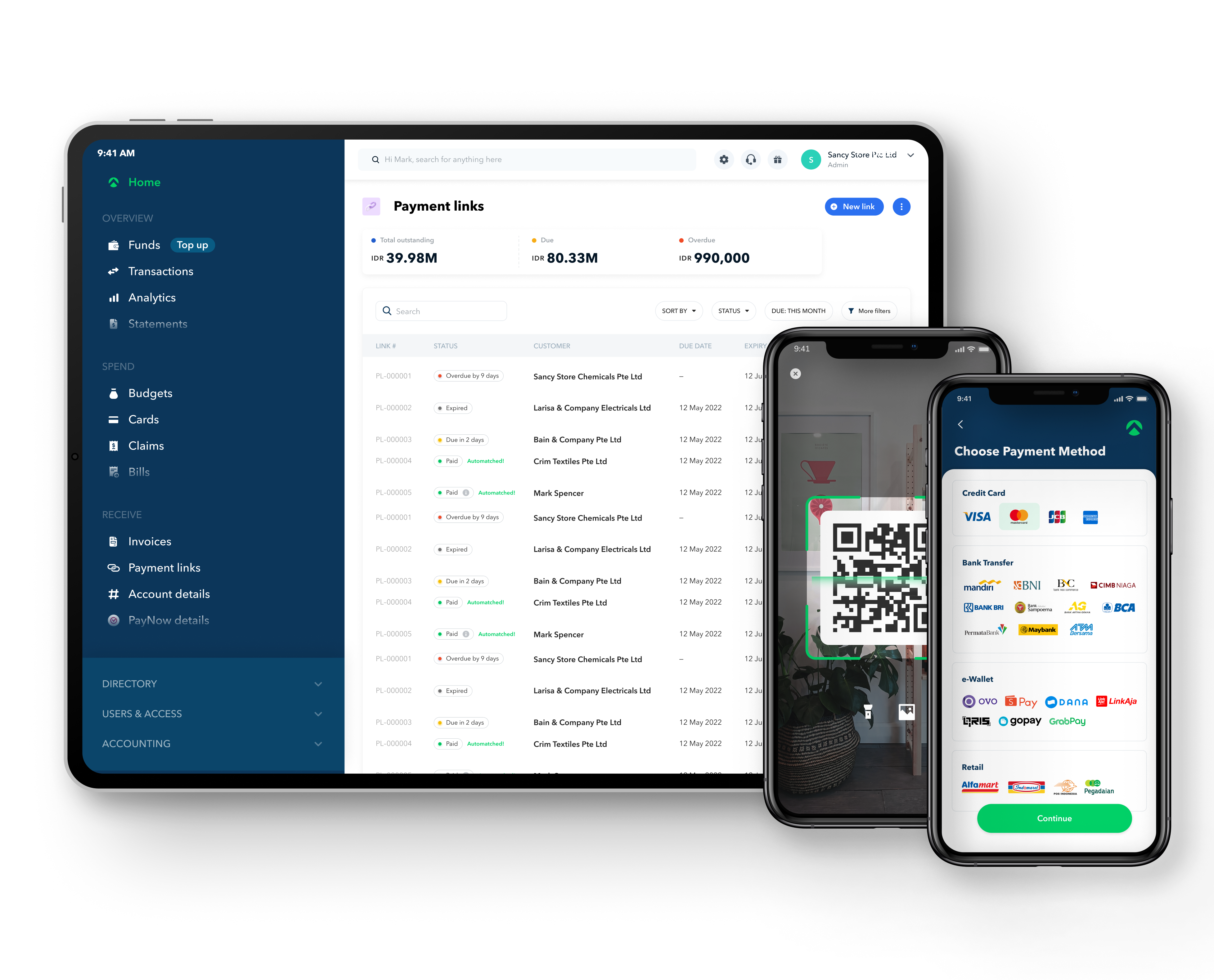 Dengan fitur manajemen pengeluaran dan tautan pembayaran Aspire, klien juga dapat mengeluarkan e-invoice dan menerima pembayaran secara instan. Ini memungkinkan bisnis untuk menerima pembayaran melalui berbagai metode pembayaran, seperti kartu, transfers bank, e-wallet, dan pembayaran ritel offline, semuanya dikelola dalam satu platform terintegrasi.