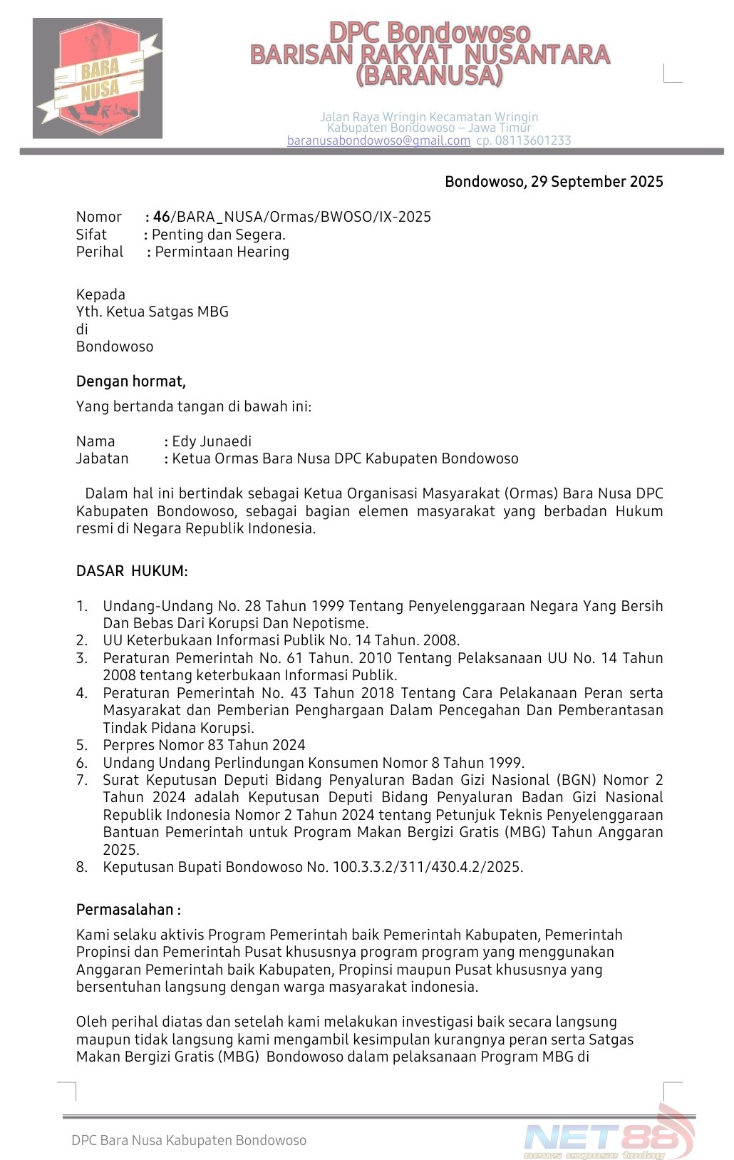 Melalui sambungan seluler Bang Juned menyampaikan, “Kami telah berkirim surat permintaan Hearing kepada Ketua Satgas MBG Bondowoso,”