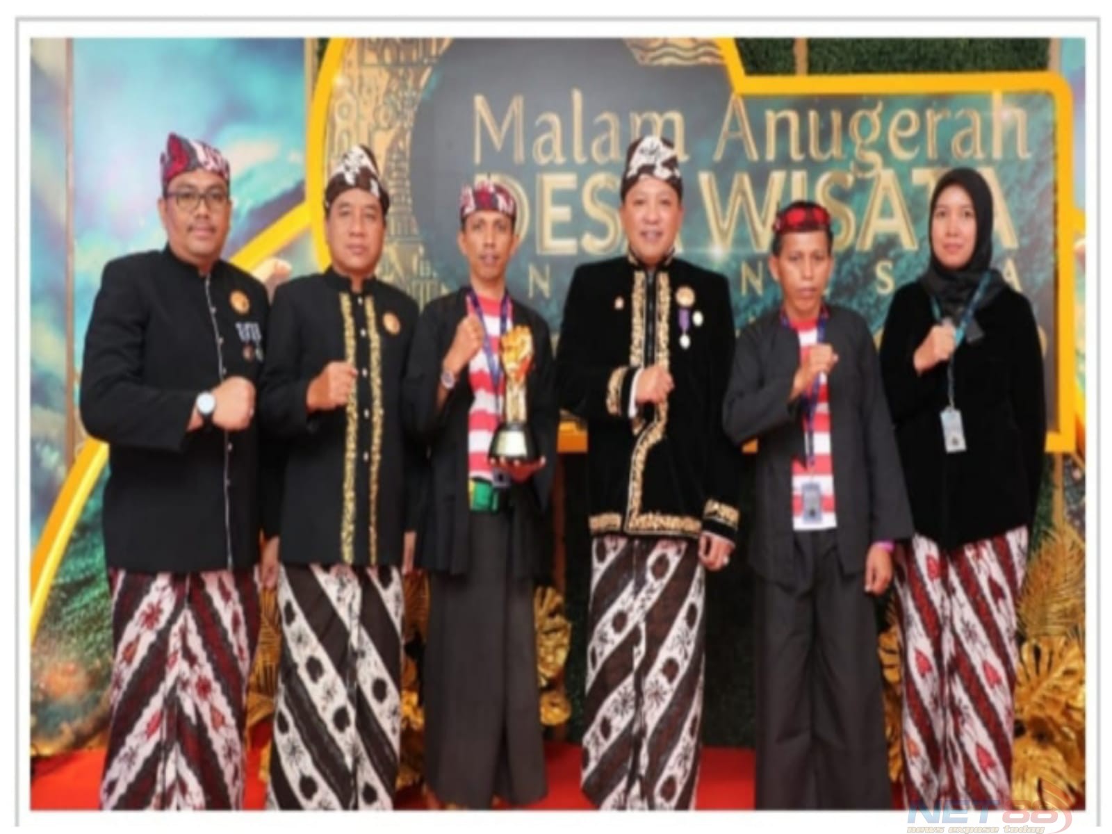 Bupati Sampang H.slamet Junaidi nampak makin karis matik dengan busana adat Sampang didampingi kadis parpora kabupaten Sampang beserta jajran pengelola wisata desa Bira tengah saat menerima penghargaan tersebut.