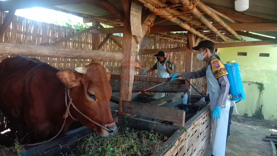 Dalam rangka mengantisipasi penyebaran Penyakit Mulut dan Kuku (PMK) jajaran Kepolisian Polres Sumenep turun langsung melakukan penyemprotan disinfektan pada kandang hewan ternak.