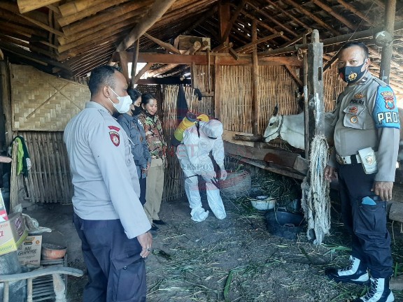 Polsek Curahdami Bersama pemerintah setempat melakukan antisipasi dan pencegahan merebaknya Wabah penyakit mulut dan kuku (PMK) dengan memberikan penyemprotan cairan pembunuh virus atau disinfektan.