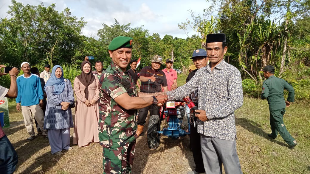 Simeulue, Kodim 0115/Simeulue beserta Dinas Pertanian Kab. Simeulue, laksanakan kegiatan penyerahan alat dan mesin pertanian (Alsintan) peletakan batu pertama pembangunan lumbung padi beserta pemberian hadiah kepada tim sanggar tari, penyerahan dilakukan secara simbolis oleh Dandim 0115/Simeulue Letkol Kav Mahdan Almahirsyah, S.Sos.,M.Si. beserta Ibu dan Kadis Pertanian Kab. Simeulue, Samsuar, SP., di Desa Muara Aman Kec. Teluk Dalam, Senin (13/6/2022).