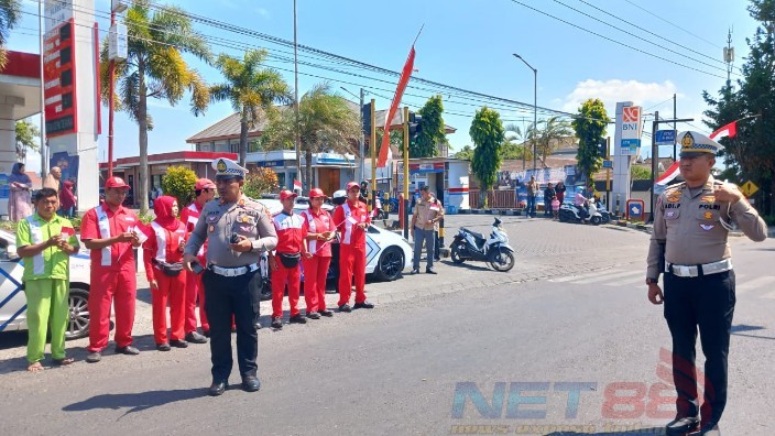 Para pengendara roda 2 maupun roda 4 dihentikan sejenak oleh pihak kepolisian Satlantas Polres Bondowoso. Selanjutnya petugas pembawa bendera merah putih maju ke tengah jalan.