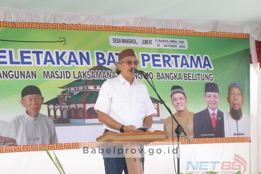 PANGKALAN BARU – Penjabat (Pj) Gubernur Kepulauan Bangka Belitung (Kep. Babel) Ridwan Djamaluddin bersama Bupati Bangka Tengah Algafry Rahman dan Wakil Bupati Bangka Barat Bong Ming Ming hadir dalam peletakan batu pertama pembangunan Masjid Laksamana Cheng Ho Bangka Belitung, Jumat (7/10/2022).