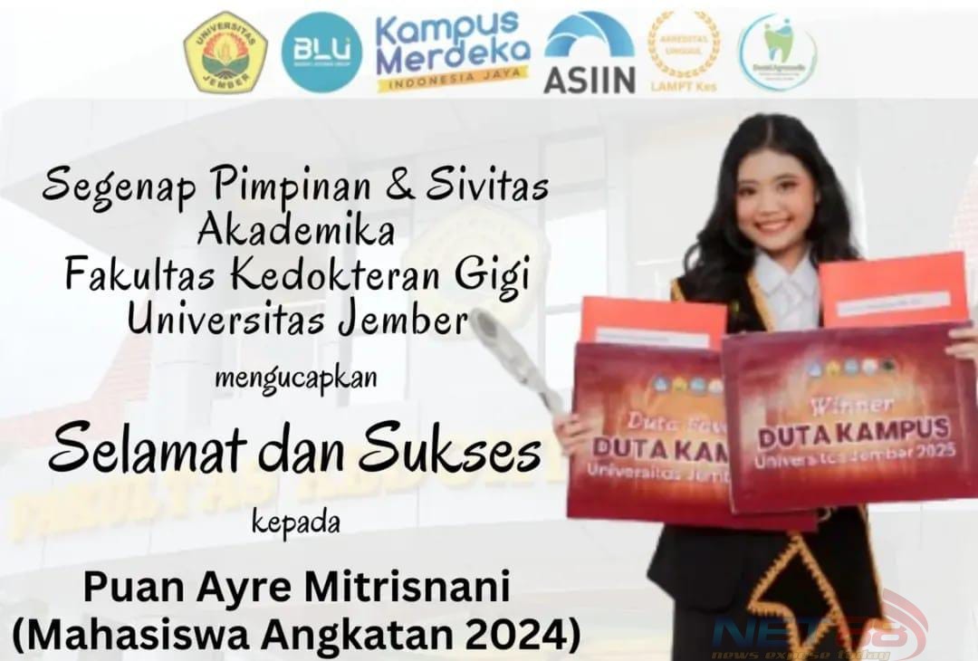 Setiap generasi memiliki bintang yang lahir untuk bersinar lebih terang dari yang lain. Di antara gemerlap prestasi Mahasiswa Universitas Jember (UNEJ), satu nama melesat menjadi sorotan publik Puan Ayre Mitrisnani, mahasiswi Fakultas Kedokteran Gigi yang berhasil menorehkan sejarah sebagai Winner Putri Duta Kampus 2025 sekaligus Duta Kampus Favorit.