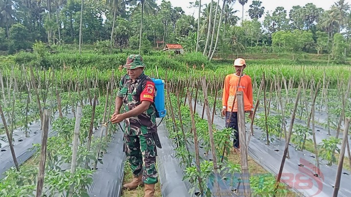 Dalam mendukung program ketahanan pangan Babinsa Posramil 0826-12/ Kadur Serka Alfred Tef Toh ikut melaksanakan pendampingan produktif pertanian kepada warganya dengan melaksanakan penyemprotan pupuk tanaman cabai di Dusun Pandian Desa Sokolelah Kecamatan Kadur.