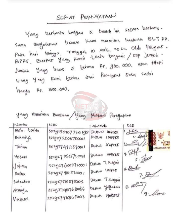 Bantuan yang seharusnya diberikan Rp.900 ribu tiap tiga bulan sekali, Namun Ketika penerima mengambil dari balai desa beberapa waktu silam, mereka hanya menerima Rp.300 ribu, Selasa (12/07/2022)
