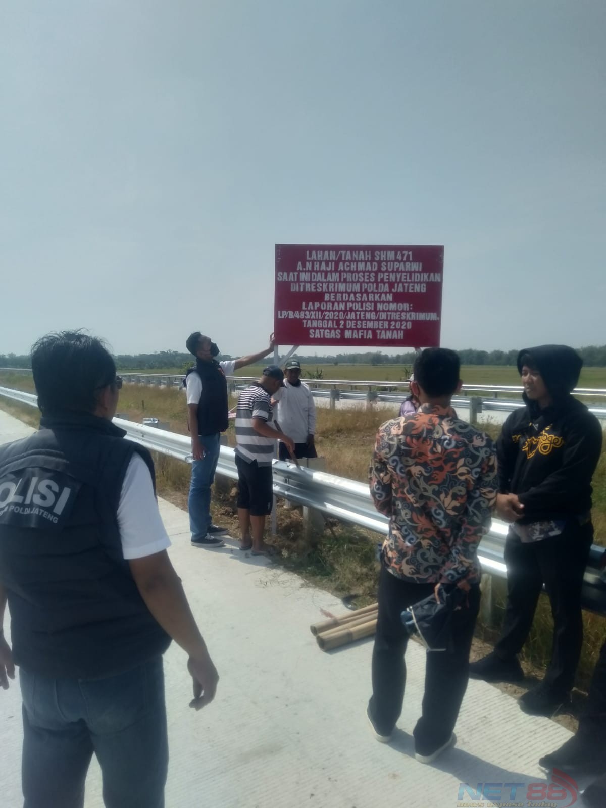 Satgas Mafia Tanah Subdit 2 Harda Bangtah Ditreskrimum Polda Jateng memasang plang di jalan tol Semarang Demak sebagai tanda bukti dilakukan proses penyelidikan tanah milik Ahmad Suparwi yang diduga “dicaplok” proyek jalan tol Semarang Demak.