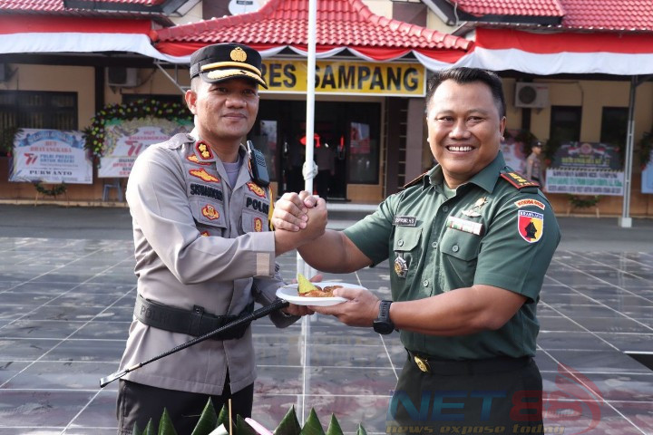 Kapolres Sampang AKBP Siswantoro S.IK, MH saat acara tasyakuran serah terima jabatan dan kenaikan pangkat mengucapkan terima kasih kepada Dandim 0828 Sampang Letkol Czi Subrobo Harjo Subroto SE, M.Han beserta pejabat utama Kodim 0828 Sampang yang telah melakukan kunjungan dan memberikan surprise kepada keluarga besar Polres Sampang yang masih merayakan Hari Bhayangkara ke-77.