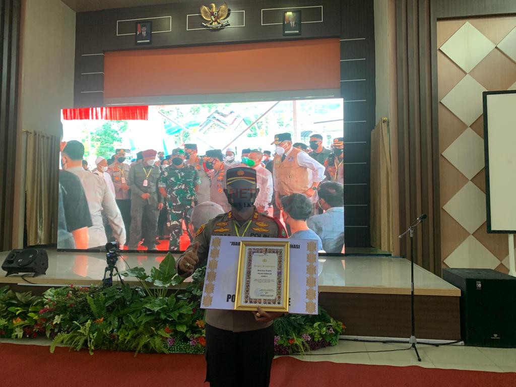 Kapolres Simeulue AKBP Pandji Santoso S.I.K.,M.Si menerima penghargaan dan hadiah yang diserahkan langsung oleh Kapolri atas keberhasilan capaian target Vaksin yang berlangsung di Kantor LPMP (Lembaga Penjamin Mutu Pendidikan Aceh) yang berlokasi di Desa Niron, Kecamatan Sukamakmur, Aceh Besar, Jum’at (25/02/2022) sore.