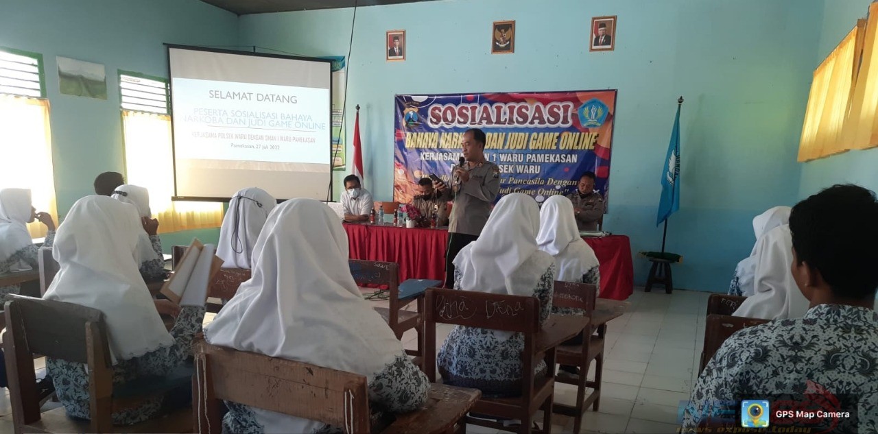 Kapolsek Waru AKP Anwar Subagyo S.H., didampingi Wakapolsek IPTU Zainollah, S.H., turun langsung memberikan sosialisasi bahaya penyalahgunaan Narkoba dan Game Judi Online kepada siswa siswi SMAN 1 Waru.