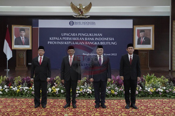 Gubernur Kepulauan Bangka Belitung (Babel), Erzaldi Rosman menghadiri pengukuhan Kepala Kantor Perwakilan Bank Indonesia (BI) Bangka Belitung yang baru, Budi Widihartanto. Pengukuhan dilakukan langsung oleh Deputi Gubernur Bank Indonesia, Juda Agung di Ruang Tanjung Kelayang, Kantor Perwakilan Bank Indonesia Provinsi Kepulauan Bangka Belitung, Senin (21/3/2022). Kegiatan ini sekaligus juga memperkenalkan Budi Widihartanto kepada para stakeholders strategis di wilayah Bangka Belitung.