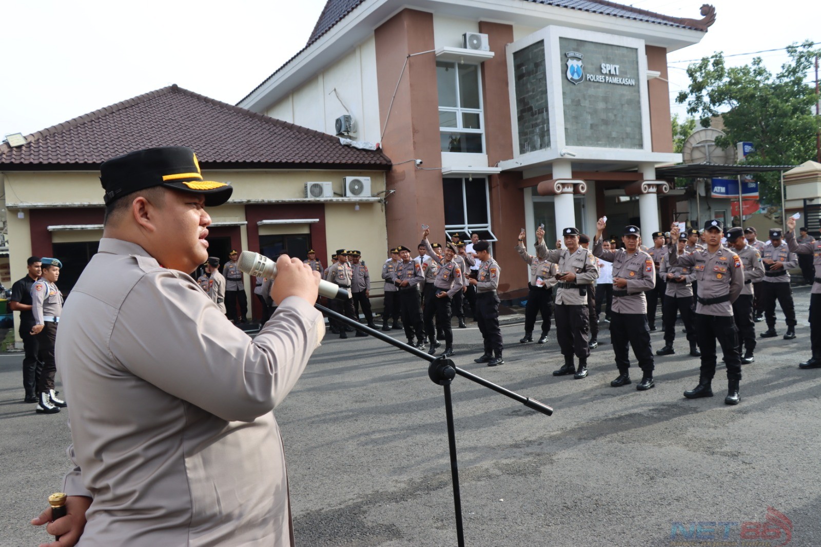 Orang nomor satu di jajaran Polres Pamekasan tersebut memeriksa satu persatu barisan anggotanya untuk mengecek kelengkapan dan kerapian.