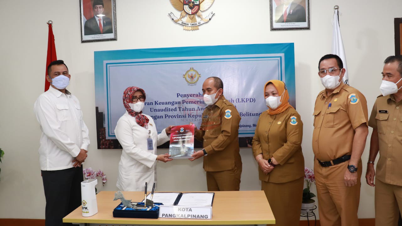 Wali Kota Pangkalpinang Maulan Aklil menyerahkan langsung secara simbolis Laporan Keuangan Pemerintah Daerah (LKPD) unaudited Pemerintah Kota Pangkalpinang tahun anggaran 2021 kepada Kepala Perwakilan BPK Provinsi Kepulauan Bangka Belitung Ida Farida, di kantor BPK RI Perwakilan Provinsi Kepulauan Bangka Belitung, Senin (21/3/2022).