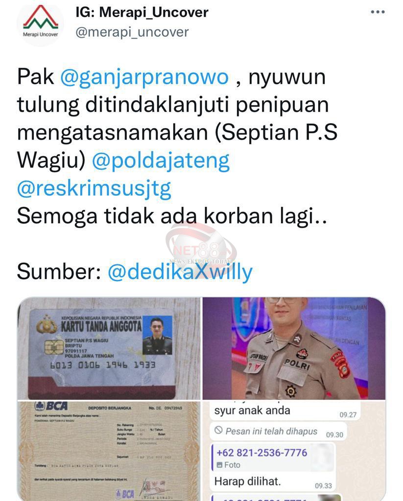 “Pak @ganjarpranowo, nyuwun tulung ditindaklanjuti penipuan mengatasnamakan (Septian P.S Wagiu) @poldajateng @reskrimsusjtg Semoga tidak ada korban lagi.,” cuit akun tersebut.