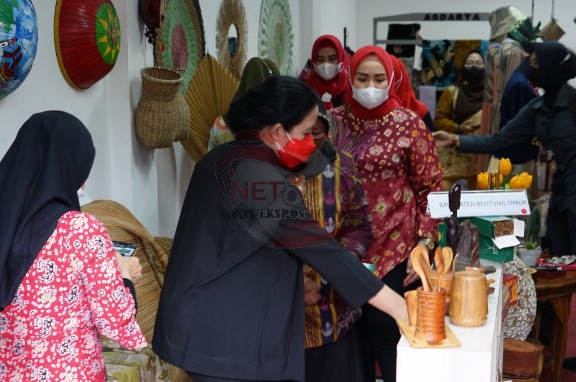 Rumah Bunda menjadi gerai pertama yang ia kunjungi di Destar Point. Tampak Puan Maharani melihat-lihat hingga memilih beragam aksesoris, batik, cual dan kerajinan lokal Bangka Belitung lainnya.