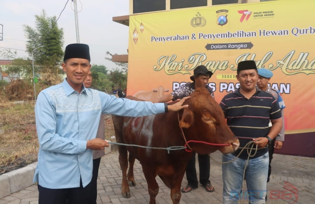 Usai melaksanakan Sholat Idul Adha, Kapolres Pasuruan memimpin kegiatan Penyerahan dan Penyembelihan hewan Qurban dari Polres Pasuruan, bertempat di halaman Rusun Polres Pasuruan tepat dibelakang Mapolsek Bangil.