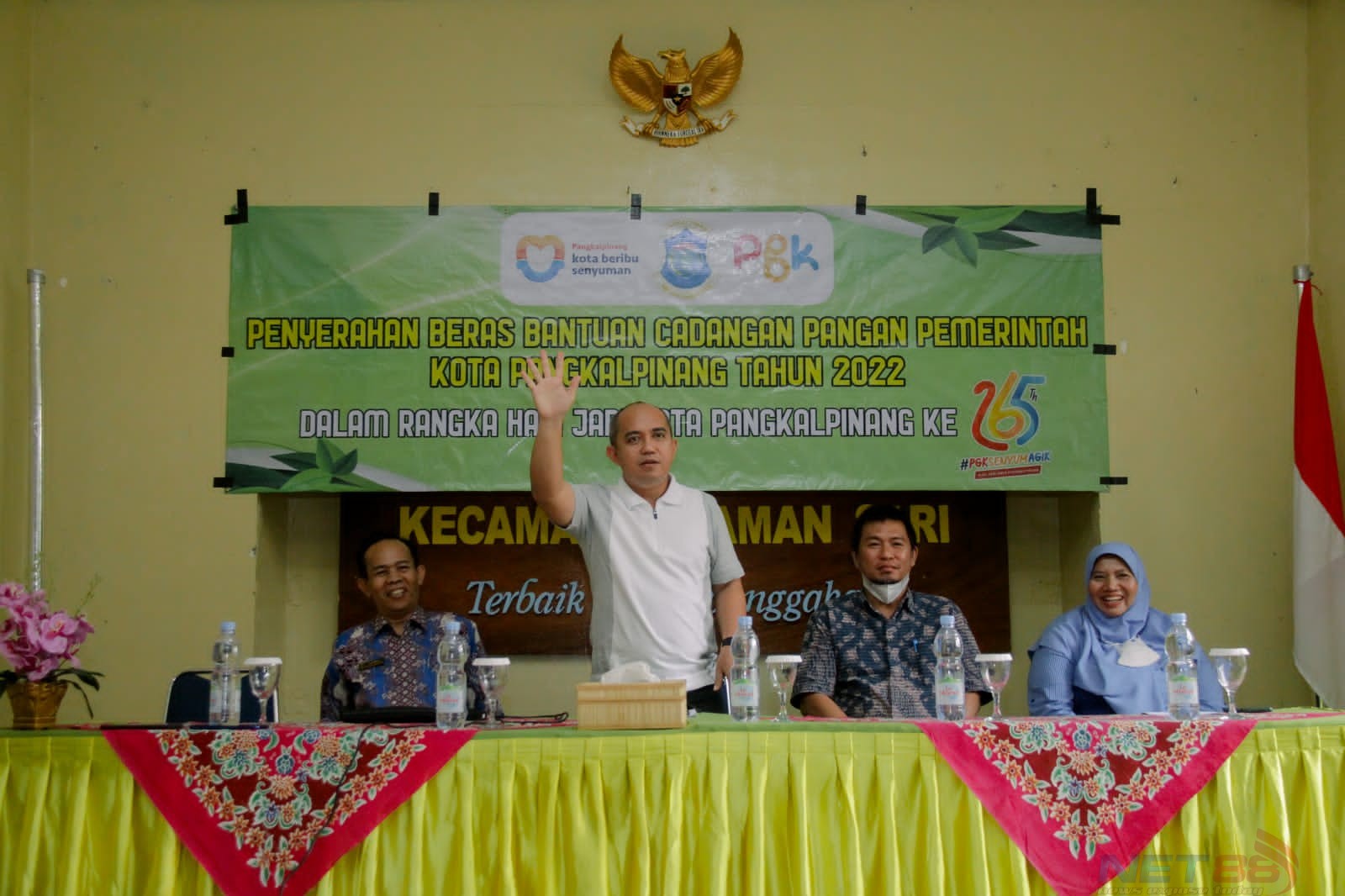 Wali Kota Pangkalpinang, Maulan Aklil membagikan 106 paket beras kepada warga membutuhkan, Kamis (8/9/2022) di Aula Kantor Kecamatan Taman Sari.
