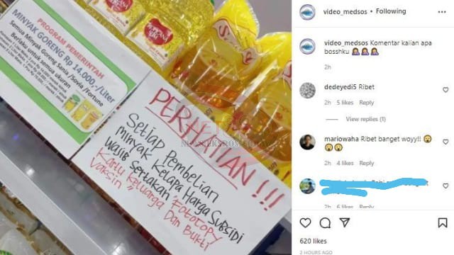 “Perhatian!!! Setiap pembelian minyak kelapa harga subsidi wajib sertakan fotocopy Kartu Keluarga dan Bukti Vaksin,” tulis pengumuman minimarket tersebut.